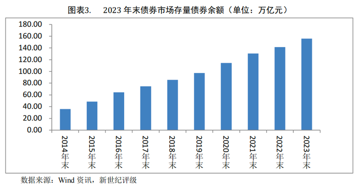 从债券市场存量规模看,截至2023年末,全国债券市场存量债券余额155.73万亿元,较2022年末增加14.36万亿元。