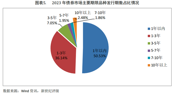 从发行期限看,2023年发行的债券以短期为主,但1-3年期债券发行支数占比明显上升。其中1年以下期限品种占同期债券发行支数的50.53%,占比依然过半,但较上年下滑19.41个百分点;1-3年期占比为36.14%,较上年增加20.83个百分点,增幅明显;3-5年期、5-7年期、7-10年期以及10年以上期限占比分别为36.14%、7.05%、1.95%、1.86%和2.48%,5年期以下债券合计占比93.71%。