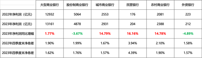 而股份制商业银行和外资银行2023年净利润较2022年则为负增长,分别为-3.67%和-4.89%。