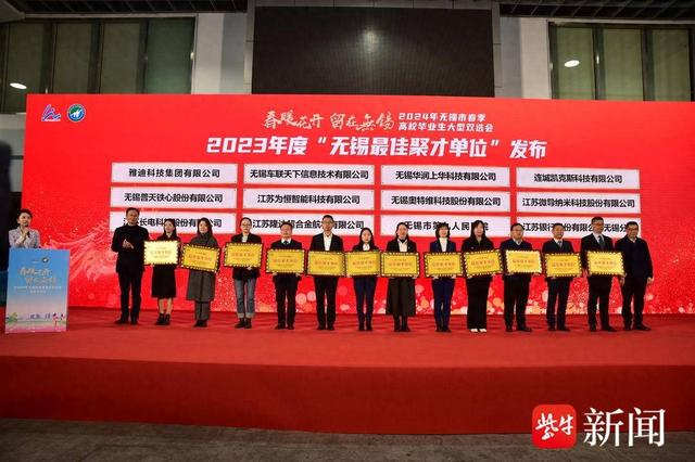 现场还发布了2023年度“无锡最佳聚才单位”名单,雅迪科技集团有限公司、无锡华润上华科技有限公司等12家单位获此殊荣。无锡学院党委常委、副校长左同宇和中共无锡市委组织部副部长、党建办主任林茂松为2023年度“无锡最佳聚才单位”颁授铜牌,鼓励他们在引才聚才方面做出更大贡献。无锡市人力资源和社会保障局党委委员、副局长余仁昌在启动仪式上热情地推介了无锡人才创新创业环境、“锡引”工程政策,从安居、乐业、发展三方面向毕业生们传递无锡这座城市爱才敬才、育才兴才的满满诚意。最后,中共无锡市委常委、常务副市长蒋敏宣布2024年无锡市高校毕业生春季招聘活动正式启动。