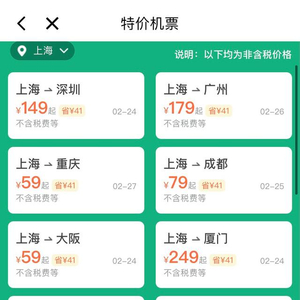 2月22日,新京报贝壳财经记者在春秋航空App发现,目前有不少特价机票可以“捡漏儿”,如2月24日上海飞大阪,不含税价59元起;2月27日上海飞济州岛,不含税价59元起;2月27日上海飞重庆,不含税价59元起……