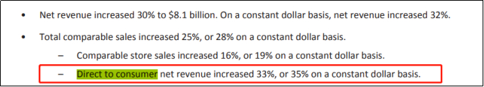 渠道端,Lululemon算是搭上了电商的顺风车。2008-2009年,受到全球金融危机的影响,lululemon也承受过库存积压的噩梦。彼时刚好是全球电商经济高速发展的节点。于是开始布局线上DTC(direct to customer)+线下全渠道的模式,线下扩张直营门店,将线下门店打造成瑜伽及运动爱好者的聚居地,精准定位潜在客户并维持老用户的粘性,甚至有一些门店开在了瑜伽室和健身房旁边。不过渠道贡献较大的还是线上DTC(Lululemon单纯将DTC定位为线上渠道),2018年第一季度Lululemon旗下300余家门店开始推出“线上购买门店发货”服务;2018年下半年开始陆续推出”线上购买门店取货”服务。线上与线下门店打通(只是官网线上门店),互补短板。根据2022年的财务报表来看,全年净利润中DTC增长达到33%,是线下门店增长16%的一倍多。