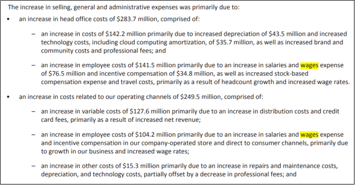 相比于明星代言,Lululemon认为既然品牌的定位是“super girls”,那么最理想的员工类型也正是super girls。虽然短期意味着更高的薪水福利,更多的投入员工发展计划,但员工和消费者之间建立的高质量的连接价值带来的未来收益是更大的,这似乎也就能解释为何公司SG&A增长明显的是wages了。