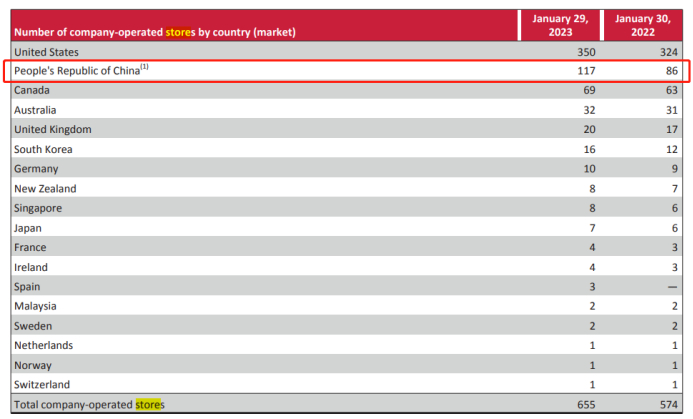 无疑就是中国。首先从开店数量来看,2022年财年,Lululemon在国内的店铺数从2020年的55家增长至2022年的117家,两年翻倍,2026年计划继续翻倍至220家。再者,中国市场收入三年涨50%,领跑全球。难怪中国是上表中线下门店增长最快且仅次于美国的最大市场。