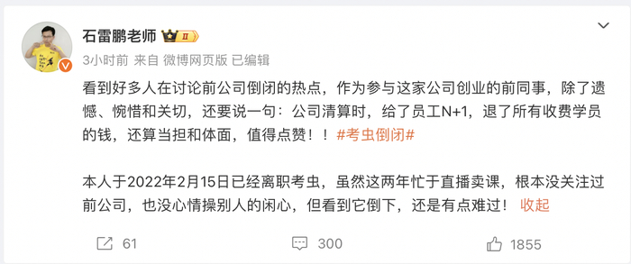 微博认证为考虫英语名师的“石雷鹏老师”于2022年2月15日离职考虫,他在微博上表示,“他看到好多人在讨论前公司倒闭的热点,作为参与这家公司创业的前同事,除了遗憾、惋惜和关切,还要说一句:公司清算时,给了员工N+1,退了所有收费学员的钱,还算当担和体面,值得点赞!!”