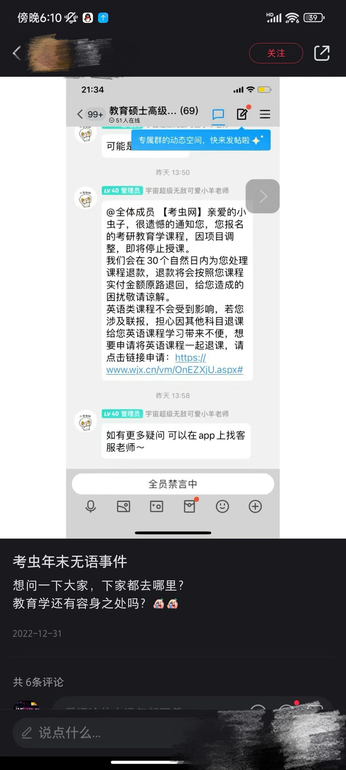 澎湃新闻看到,有网友在2022年12月31日晒出的图片显示,考虫网管理员发布消息称,学员“报名的考研教育学课程因项目调整,即将停止授课。我们会在30个自然日内为您处理课程退款”。
