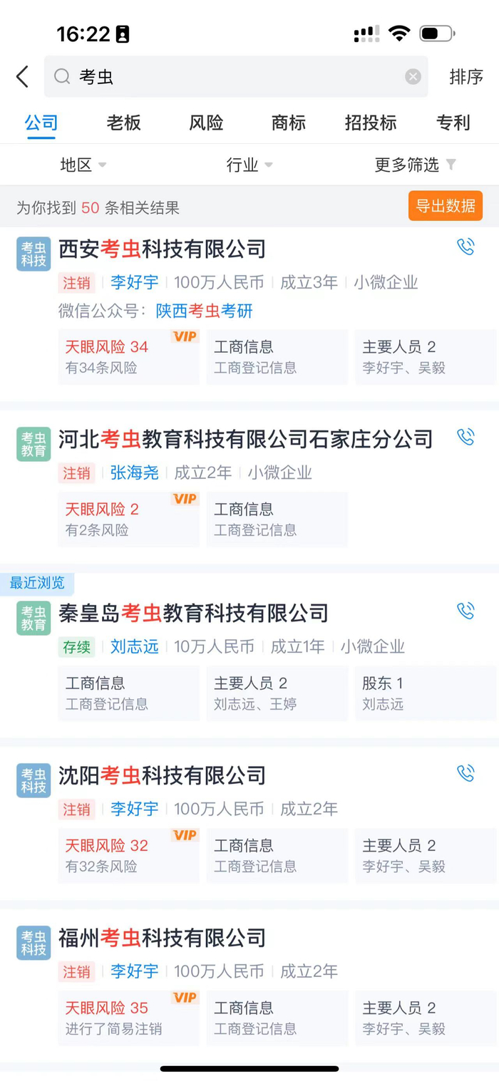 考虫旗下河南考虫教育科技有限公司一名工作人员向澎湃新闻表示:对总部的情况不太了解。目前河南线下业务铺不下去,河南子公司正在办理注销业务,有人离职,但是还没有收到总部的通知。工商资料显示,考虫旗下沈阳、西安、河北、福州等地的子公司已被注销。
