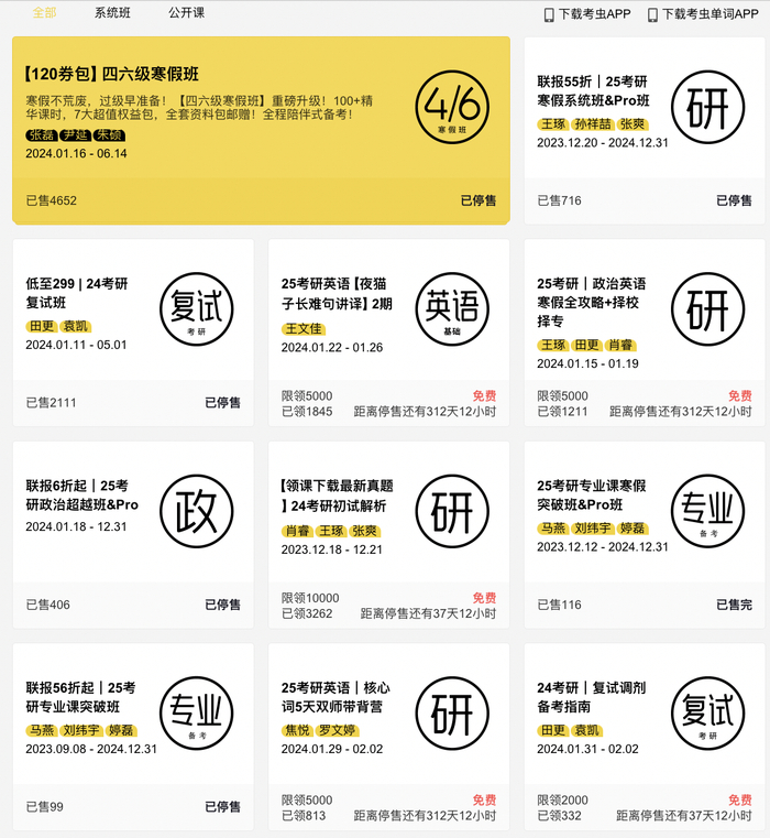 在考虫的官网页面,2024年1月开出的数个课程均已停售。2月22日下午,澎湃新闻记者询问考虫人工客服,对方表示项目:“取消了,不再授课了”,App可以用到何时“不太清楚”。官网的电话一直处于忙音状态,其官网微信的最后一次更新是2月20日。