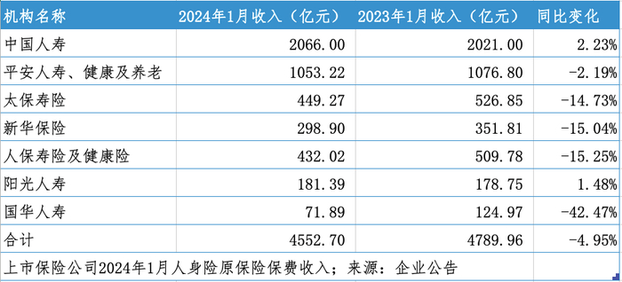 1月,中国人寿、中国平安人寿、健康及养老险、太保寿险、新华保险、人保寿险及健康险、阳光人寿、国华人寿7家公司共实现保费收入4552.7亿元,同比减少4.95%。
