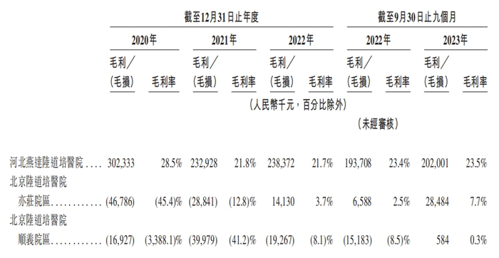 划分不同医院来看,2018年开业的北京陆道培医院亦庄院区直到2022年毛利才转正;2020年开业的北京陆道培医院顺义院区则2023年得以转正,但毛利率仍处于十分低的水平,2023年前三季度为0.3%。
