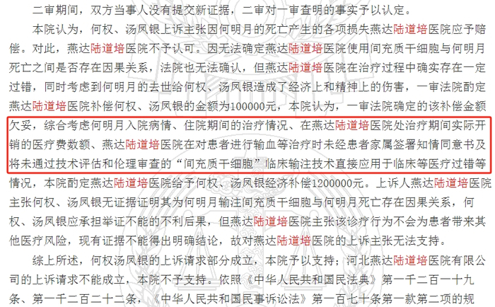 2021年5月,经二审判决,法院认为河北燕达陆道培医院不能证明医院主张该诊疗行为不会为患者带来其他医疗风险,因此责令河北燕达陆道培医院赔偿患者120万元。