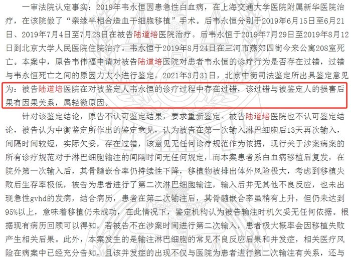中国裁判文书网显示,陆道培医疗旗下河北燕达陆道培医院对患者进行治疗时,未经家属签署同意知情书,将未通过技术评估和伦理审查的“间充质干细胞”临床输注技术直接应用于临床。
