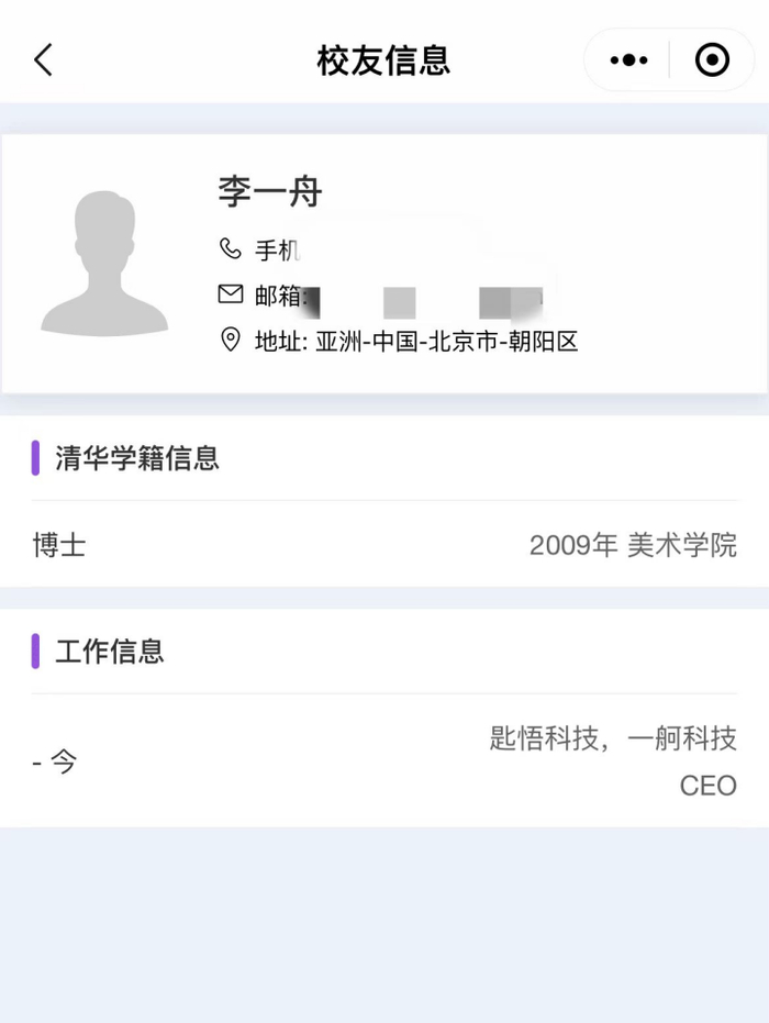 一是其清华博士的身份。事实上,李一舟清华博士的身份并不假。根据清华大学的校友通讯录,李一舟的学籍信息显示为2009级美术学院的博士,工作信息则显示为“匙悟科技和一舸科技CEO”。