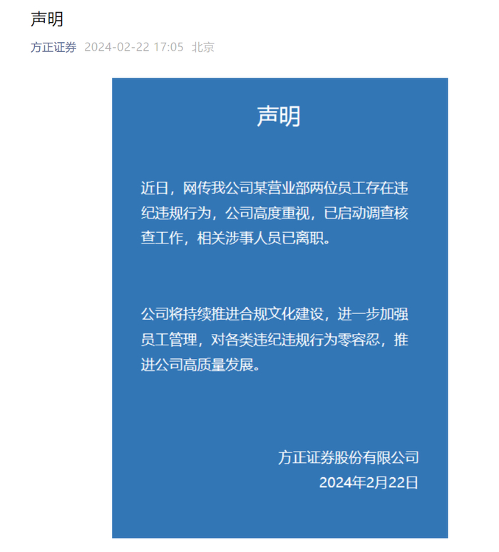 2月22日晚,方正证券发布声明称,针对网传某营业部两位员工存在违纪违规行为,公司高度重视,已启动调查核查工作,相关涉事人员已离职。