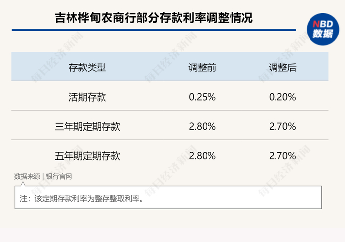 同一天,吉林榆树农商行发布公告称,根据利率市场化需求,决定从2024年2月22日零时起,统一调整活期存款、三年及五年期整存整取定期存款利率执行上限,活期利率下调至0.2%,三年及五年期利率下调至2.7%。
