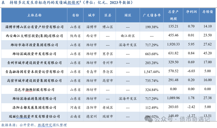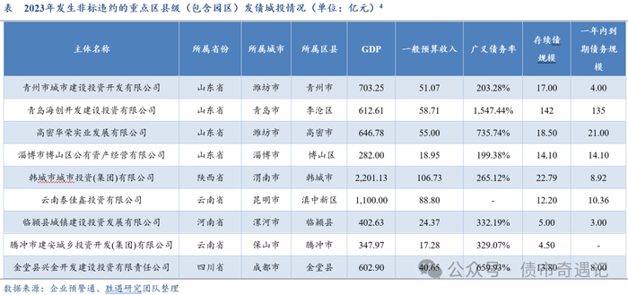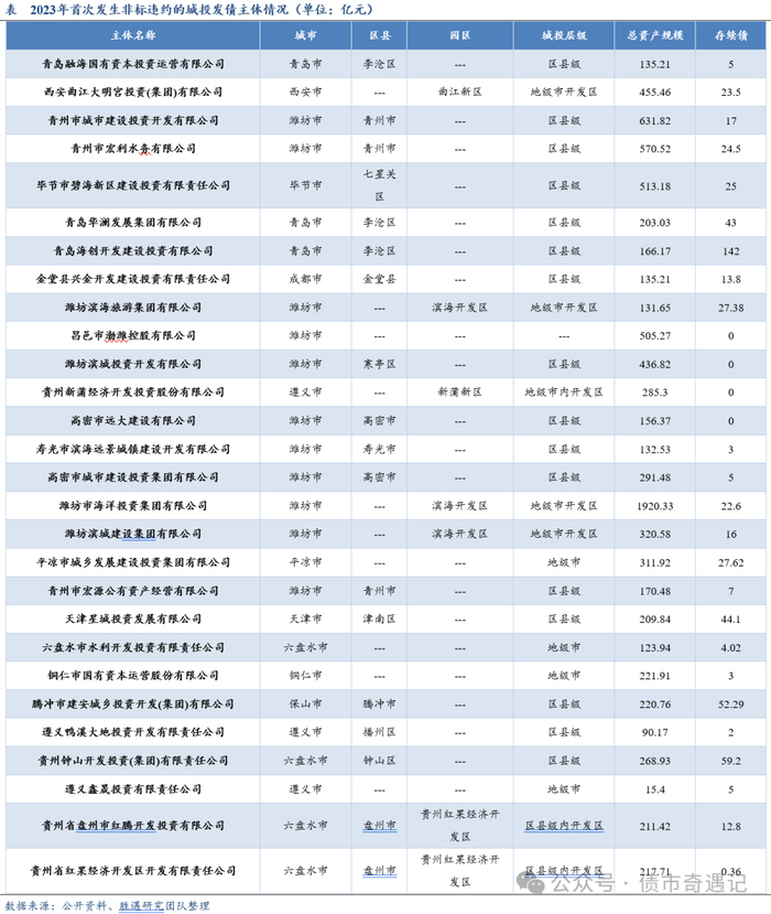 无论是作为融资方还是担保方,多个发债城投均存在多次发生非标违约的事件。我们筛选出2023年的具体情况,除贵州以外,潍坊市及下辖区县平台仍是非标重灾区,主要包括潍坊市寒亭区、青州市、高密市和滨海开发区;除此之外,淄博博山区、西安曲江新区、洛阳老城区和德宏瑞丽市城投也发生多起非标违约事件。区域融资难度持续加码,在省级政府负总责的要求下,高发区若无法解决非标风险问题,区域间的扩散可能仍会陆续出现。