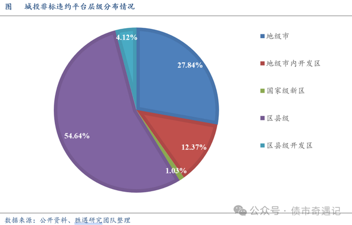 从城投平台的层级看,城投企业非标违约多发生在区县级城投平台,层级较低,累计数量53家,占比达54.64%;其次,地级市平台非标违约主体数量有27家,占比为27.84%,主要包括潍坊市、六盘水市、遵义市、昆明市和黔南布依族苗族自治州等。此外,地级市内开发区发生非标违约主体数量也达12家,主要包括潍坊滨海经济技术开发区、贵州红果经济开发区(两河新区)、遵义新浦新区和昆明高新技术产业开发区等。