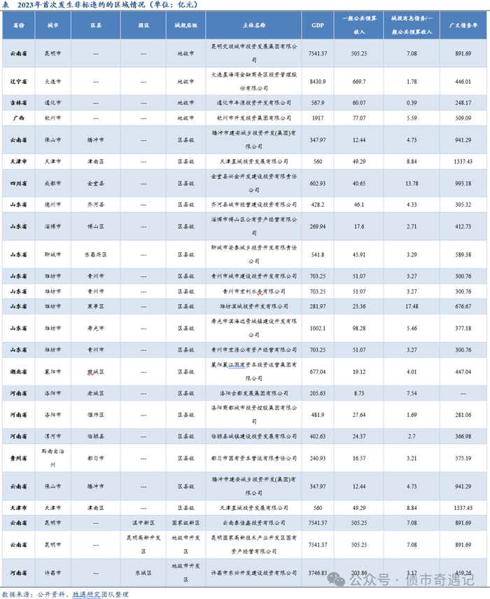 从首次发生非标违约的区域来看,2023年新增非标违约区域主要集中发生在山东、河南、贵州、云南等区县级;值得注意的是,云南省昆明市、辽宁大连市、吉林通化市和广西钦州市首次发生非标违约,均为债务压力较大的地级市;此外,昆明的滇中新区和昆明高新开发区国家级开发区也首次发生非标违约。债务规模较大的区域非标违约风险的扩散和传染大概率会愈发迅速,需关注重点区域的债务压力情况。