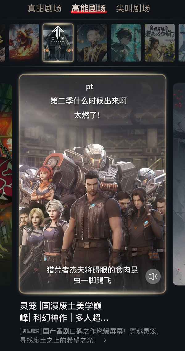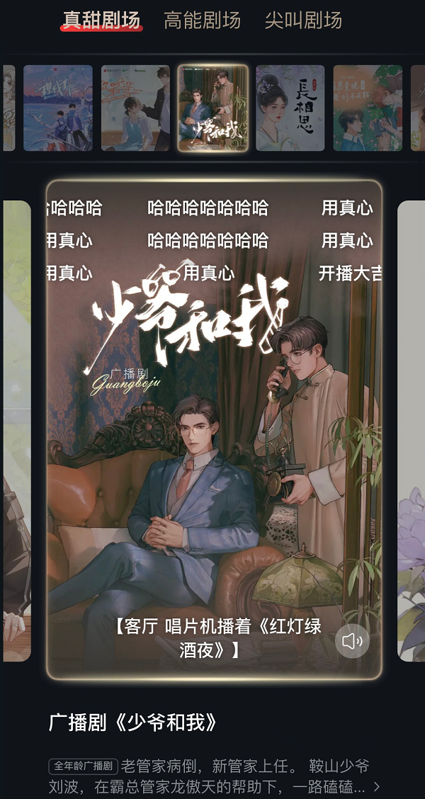 互动剧场是网易云音乐自2023年9月以来推出的听书新玩法,分为真甜剧场、高能剧场和尖叫剧场。目前,站内已有3000余部有声作品上线互动剧场,拥有专属的动态背景、插帧动画以及弹幕动效。在互动剧场的有声作品页面,用户可随时发送弹幕,槽点爽点实时精准表达;同时,在作品的进度条上,分剧场设置了特殊的标志点,点击即可一键跳转本集名场面。互动剧场成功让有声作品从“听”到“看”,丰富了有声作品的互动体验,提升了听书的沉浸感与陪伴感,让听书“不再孤单”,深受用户好评。