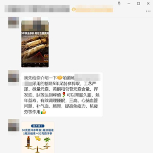 近期,食品安全社会共治工作委员会舆情大数据研究室通过监测发现,有营销人员通过微信和朋友圈对外宣传一款“固青堂牌西洋参浓缩液”的产品,营销人员推送的资料中强调产品的药食同源属性,还称该产品可以“美容养颜抗衰老”“抗炎抗病毒”“抗癌”甚至可以“延年益寿”……