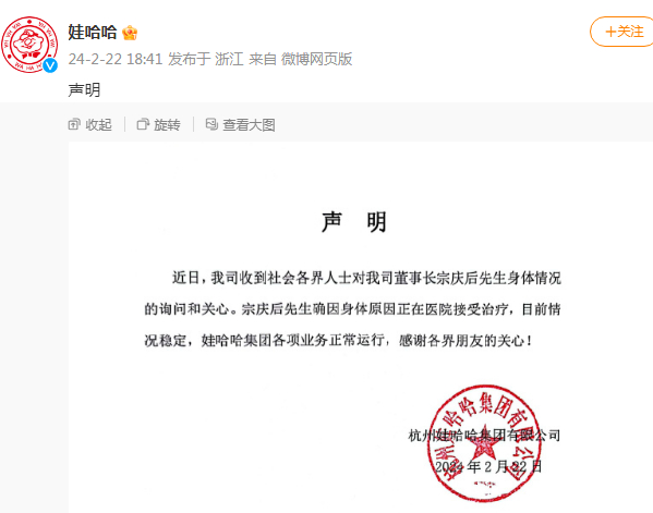 当日晚间,娃哈哈也发布声明称,近日,我司收到社会各界人士对我司董事长宗庆后身体情况的询问和关心。宗庆后确因身体原因正在医院接受治疗,目前情况稳定,娃哈哈集团各项业务正常运行,感谢各界朋友的关心。