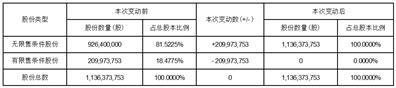 截至本公告日,公司总股本为1,136,373,753股,其中:有限售条件股份数量为209,973,753股,占公司总股本的18.4775%;无限售条件股份数量为926,400,000股,占公司总股本的81.5225%。本次申请解除限售股份为209,973,753股,占公司总股本的18.4775%,具体情况如下: