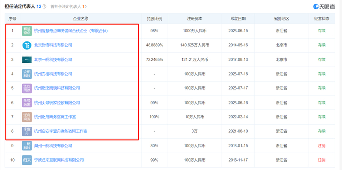 天眼查App显示,李一舟关联且存续或在业的企业有8家,其中除杭州智慧奇点商务咨询合伙企业(有限合伙)李一舟出资1000万元外,其余公司注册资本均低于150万元。