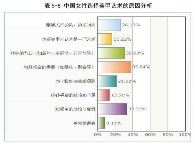 东华大学艺术学的孔诗曼琦于2018年调查了部分中国女性做美甲的原因,结果表明,中国女性做美甲主要是因为特殊场合(如婚礼、聚会等)和特殊节日的需要,烘托气氛以示自己对其的重视,还有比较多的女性是享受做美甲过程中的放松。