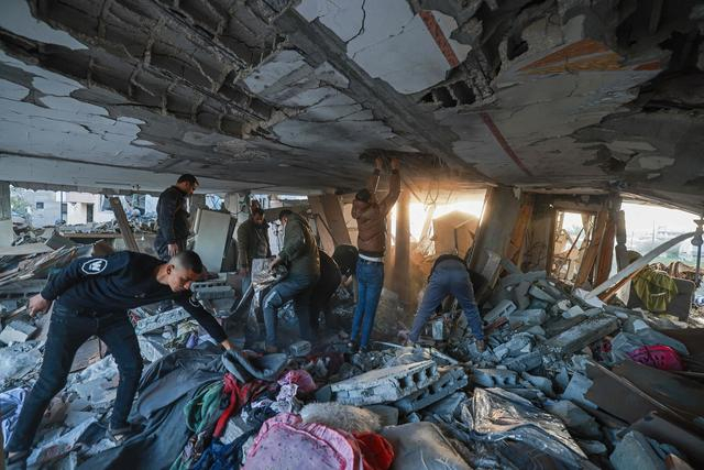 当地时间2024年2月22日,加沙地带拉法,巴以冲突持续,以色列发动夜间空袭,民众在被毁房屋的废墟中寻找自己的物品。