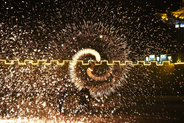 2月21日晚,甘肃省敦煌市,党河风情线,民间艺人在进行打铁花民俗表演。