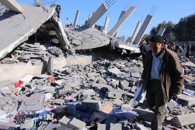 当地时间2024年2月22日,加沙地带中部扎瓦伊达地区,以色列空袭后,巴勒斯坦人走过倒塌建筑物的废墟。世界银行在一份新报告中说,巴勒斯坦经济多年来一直步履蹒跚,以色列对哈马斯的战争给巴勒斯坦经济造成了毁灭性打击。