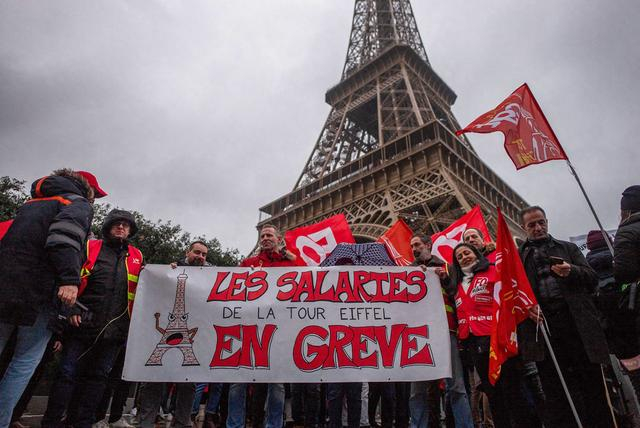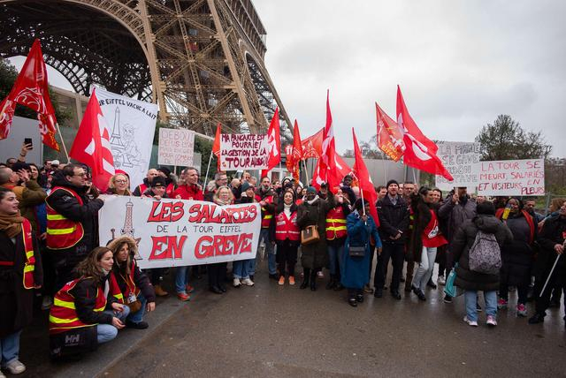当地时间2024年2月22日,法国巴黎,埃菲尔铁塔员工的罢工进入第四天。法国总工会和劳动力量工会表示,拥有埃菲尔铁塔99%股权的巴黎市政府低估了埃菲尔铁塔的维护成本,高估了收入,同时还暗示要在7月26日至8月11日在巴黎举行的奥运会期间举行罢工。
