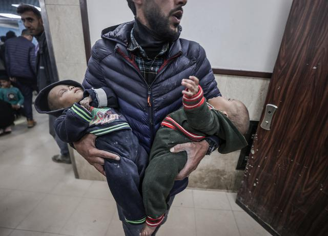 当地时间2024年2月22日,加沙地带代尔拜拉赫,以色列袭击难民营,受伤的巴勒斯坦人,包括儿童,被送往阿克萨烈士医院接受治疗。
