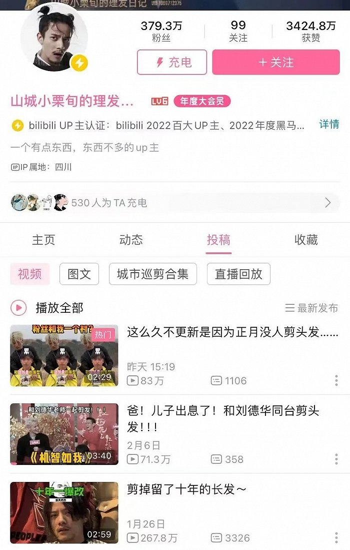 兼具颜值与技术的@山城小栗旬的理发日记就是涌现出的理发师达人之一。目前,山城小栗旬在抖音圈粉536万,B站粉丝也高达379万,B站单条视频的平均播放量在百万左右。继山城小栗旬之后,大批理发师也开始转战线上,在抖音、B站等视频平台开设账号,为线下理发店引流。