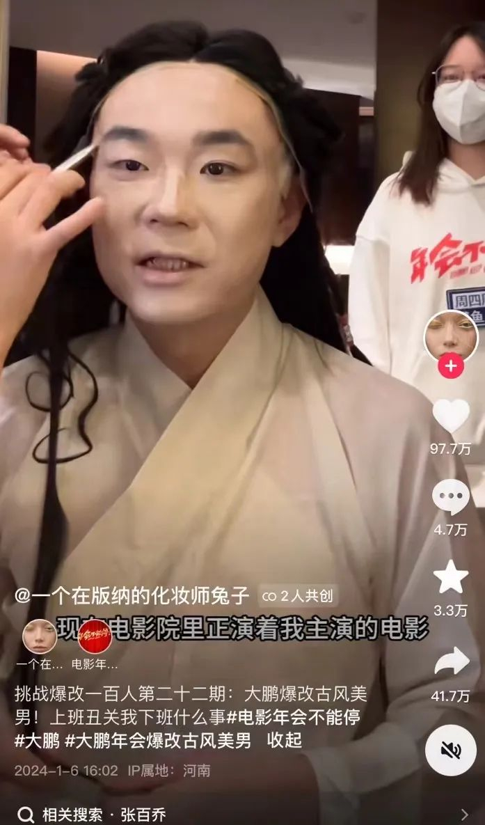 也有明星开始将爆改作为一种宣传手段,利用其热度为作品引流。大鹏、彭昱畅两人便是在电影宣发期间,先后与化妆师兔子合作了爆改视频。在视频中,化妆师兔子不断对电影内容和角色进行引导,提到彭昱畅在《我们一起摇太阳》中尝试了光头造型,两位明星也主动介绍电影剧情,大鹏更是以爆改造型与线下影迷进行互动。