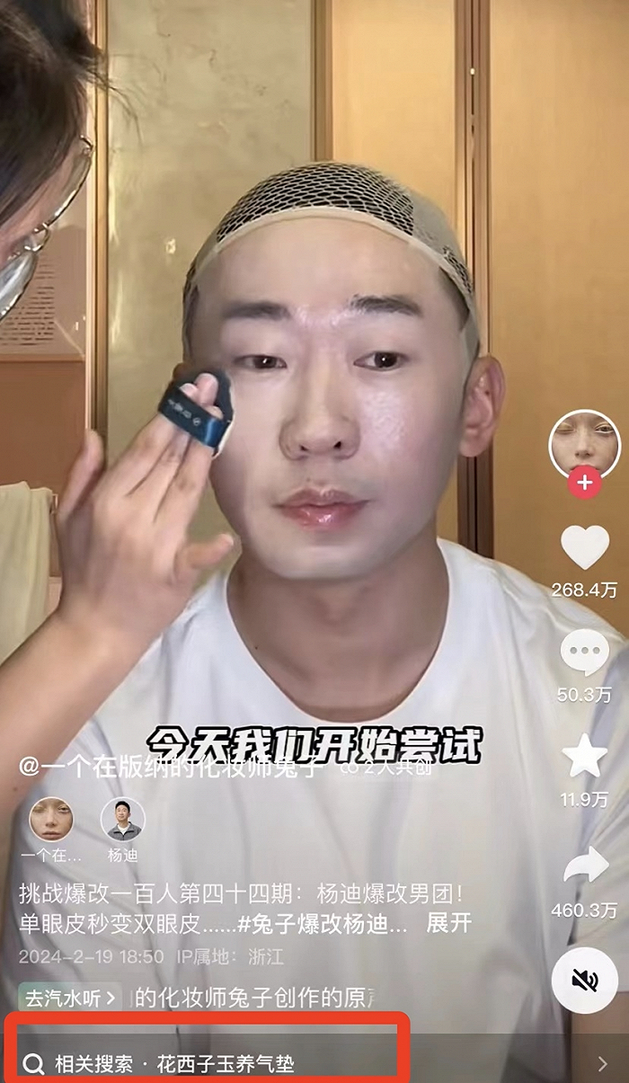朱梓骁爆改视频收获的流量与热度,不仅成功为化妆师兔子的线下写真馆——西扶海棠成功引流,还吸引了一批明星与网红的入局,大鹏、金靖、彭昱畅、张大大等人也开始主动参加爆改。热度与流量的不断汇聚,更是得到了品牌的关注,自然堂、理肤泉、花西子开始在视频中密集出镜。在杨迪爆改视频中,花西子玉养气垫就吸引了不少网友的关注。