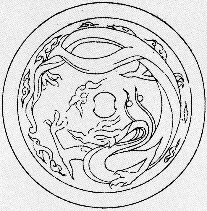 图十四-2 洛阳龙泉沟西邙山235号北宋壁画墓云龙镜线描图(洛阳市第二文物工作队:《洛阳邙山宋代壁画墓》,《文物》1992年12期)