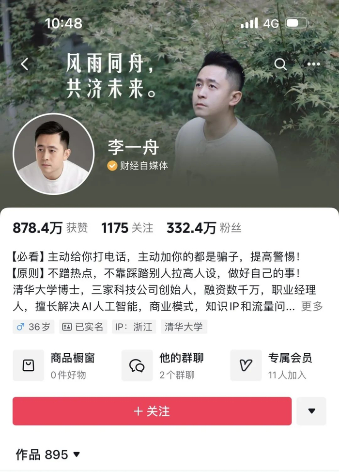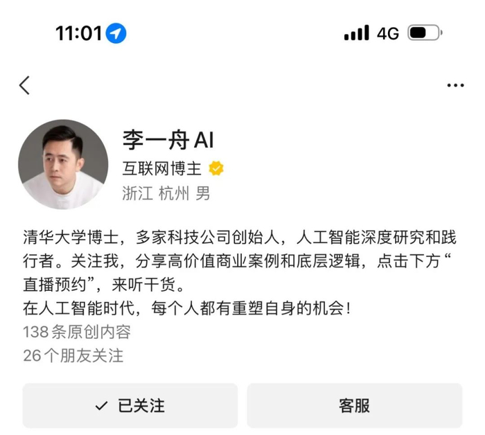 李一舟何许人也?作为销售AI课程的代表之一,他的抖音介绍贴了几个标签:清华大学博士,三家科技公司创始人,融资数千万,职业经理人,擅长解决AI人工智能,商业模式,知识IP和流量问题。