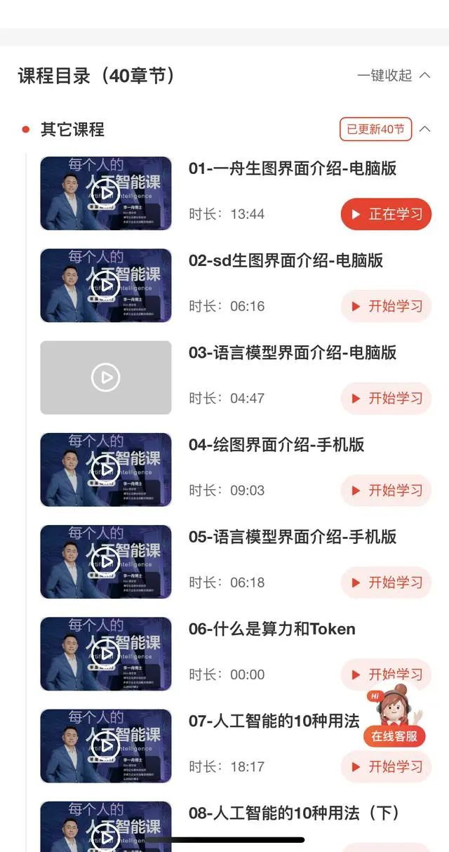 总结下来,39节课程中,6节课介绍人工智能相关技术的使用与收费,3节课是李一舟与其他人的对谈录像,2节课讲如何进行时间管理。剩余28节课程主要是相关人工智能技术的介绍、通过剪映等工具进行操作的演示。整个课程包中的24节课时长短于10分钟。