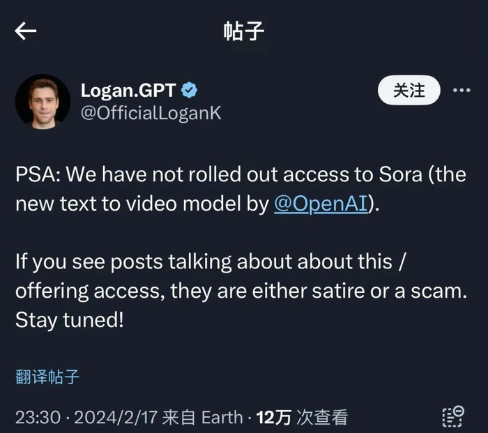 2月17日晚上,OpenAI开发者关系负责人Logan在X上称,“我们尚未推出Sora的访问权限。如果您看到谈论或提供访问权限的帖子,它们要么是讽刺,要么是骗局”。