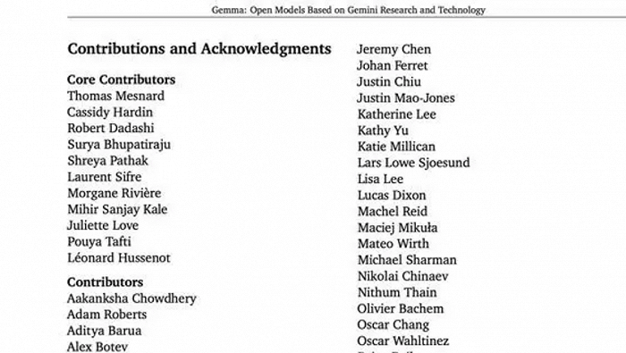 此外,根据技术论文显示,此次参与谷歌Gemma开源模型的研发人员数量高达57位。其中包括核心贡献者14人,参与者35人,产品管理2人,项目管理1人,执行赞助人5人。