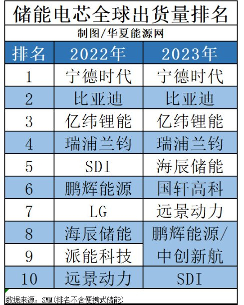 华夏能源网获悉,近日,上海有色网(SMM)公布了2023年储能电芯出货量排行榜。榜单显示,宁德时代(SZ:300750)、比亚迪(SZ:002594)、亿纬锂能(SZ:300014)位居前三甲,瑞浦兰钧(HK:00666)、海辰储能、国轩高科(SZ:002074)和远景动力紧随其后,鹏辉能源(SZ:300438)和中创新航(HK:03931)并列第八,来自韩国的电芯厂商三星SDI被挤到第十位。