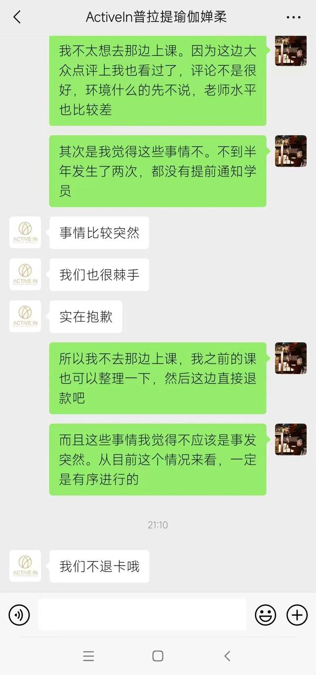 杨女士与ACTIVEIN瑜伽馆负责人关于退卡事宜的聊天记录。