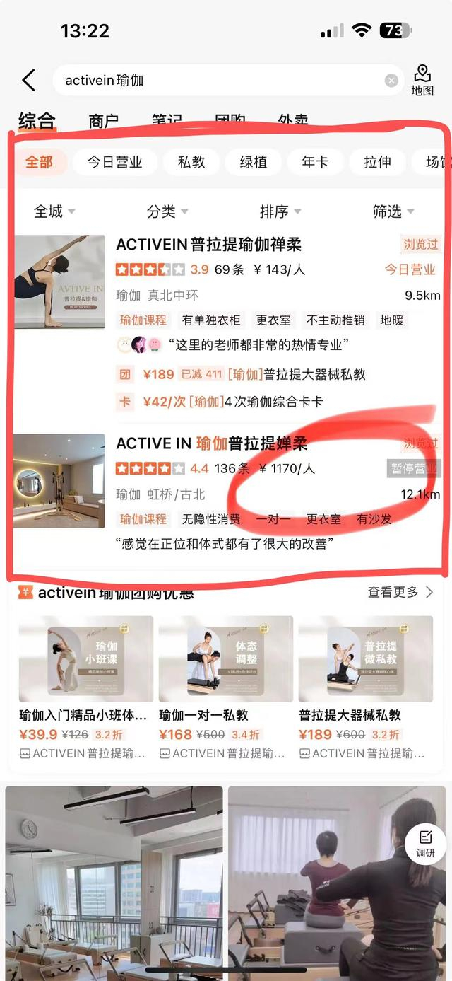 2月23日,记者通过在第三方团购平台上检索发现,平台上显示“ACTIVEIN瑜伽馆”在上海有两家门店,其中杨女士所在的虹桥古北店目前为“暂停营业”状态,ACTIVEIN瑜伽馆真北中环店仍显示为正常营业状态。