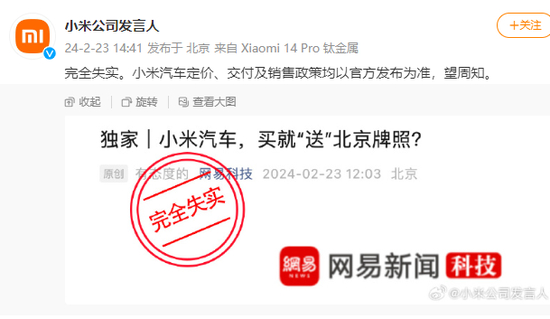 导读:小米方面表示消息完全失实。小米汽车定价、交付及销售政策均以官方发布为准。