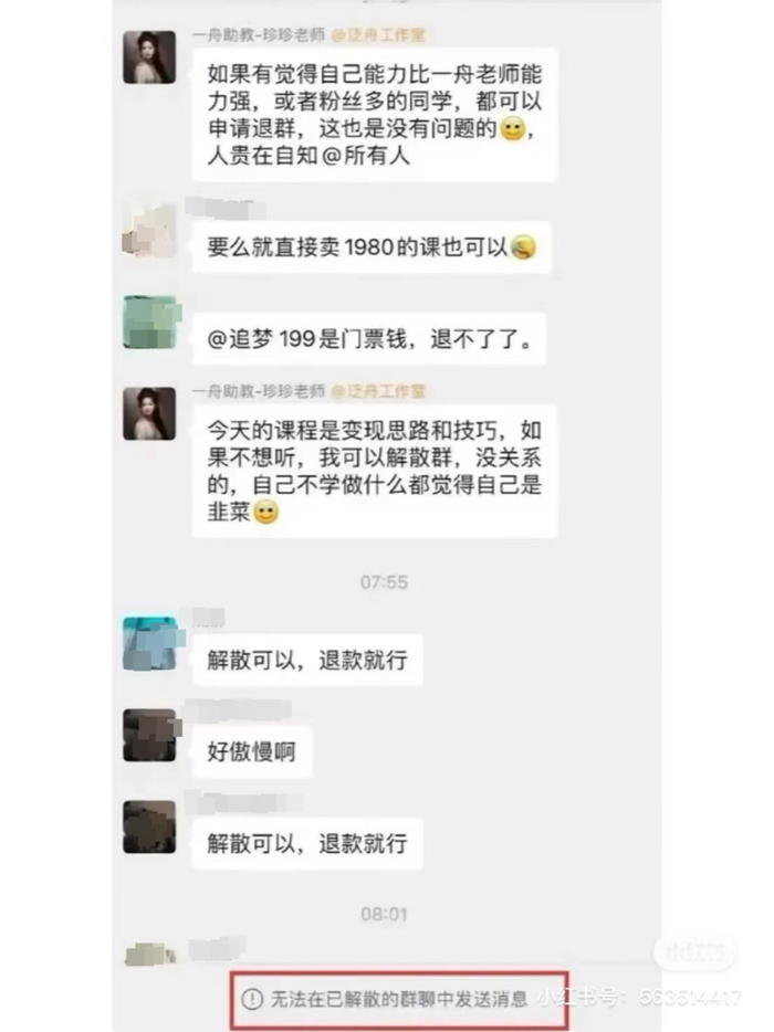然而被“割韭菜”的不止王先生一人。据20日网络流传的群聊截图显示,李一舟的某个AI实战训练营群疑似遭到助教解散。助教在群内直言不讳地表示,如果觉得自己的能力超过一舟老师,或者粉丝数量众多,都可以申请退群。助教还声称:“今天的课程是变现思路和技巧,如果不想听,我可以解散群,没关系的,自己不学,做什么都觉得自己是韭菜。”学员们对此反应强烈,纷纷表示“解散可以,退款就行”。随后,群聊截图显示“无法在已解散的群聊中发送消息”。尽管当时课程群疑似解散,李一舟本人仍在直播平台上继续售卖Al课程。