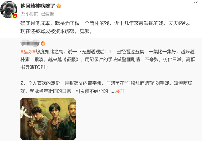 针对争议,22日,《猎冰》导演高群书发文称,这部剧是近十几年来最缺钱的戏,“天天愁钱。现在还被骂成被资本绑架。”