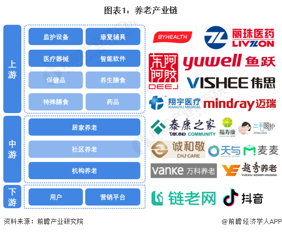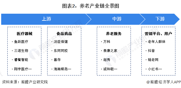 随着我国老龄人口不断增加、养老需求的不断扩张,我国养老产业链也逐渐形成。当前,以养老服务为核心,整个养老产业可划分为上游:医疗器械、食品药品、智能软件等产业,中游以提供养老服务的各类养老企业为核心,下游则是老年群体及相关营销平台。