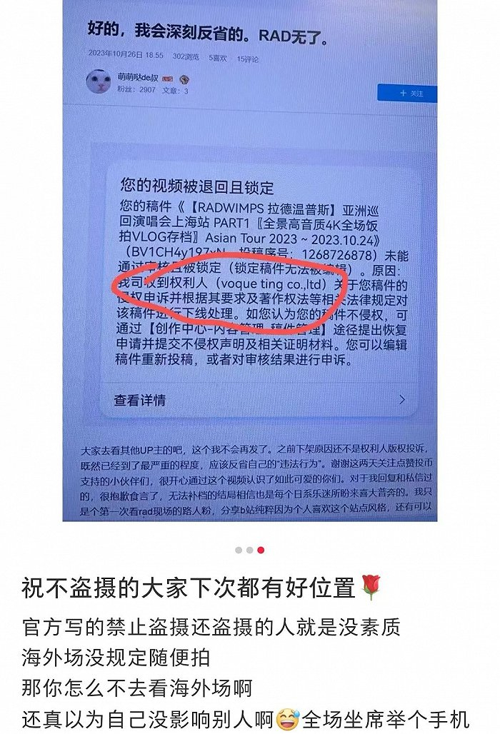 比如去年李宗盛长达2个多小时的上海站演唱会盗摄视频便在网络疯传,甚至一度出现多个角度、不同场次版本,最终也是不了了之。但RADWIMPS亚洲巡演上海站,虽然明确发布公告禁止拍摄,但部分盗摄视频被上传后,经由RADWIMPS方投诉得以下架。