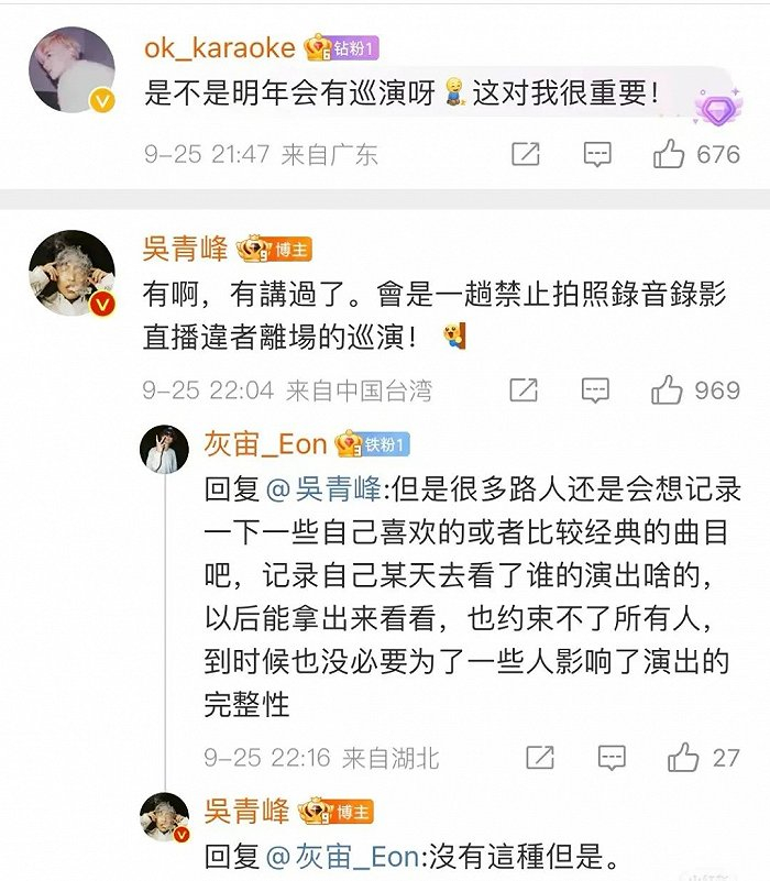 不过,看演出过程禁止盗摄的普及教育并非十分普及。在大部分观众看来,付费观演也就意味着在场内可拥有来去自如的支配权。因此,不少UP主、抖音博主等还会将自己的观演区域位置、使用设备作为“观演经验”向网友分享。即便如吴青峰这般屡次在演出前后呼吁放下手机观演,也难以在这个人人皆为社交自媒体的时代,压住大众每时每刻都存在的分享欲。